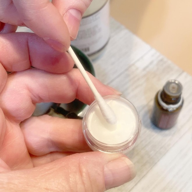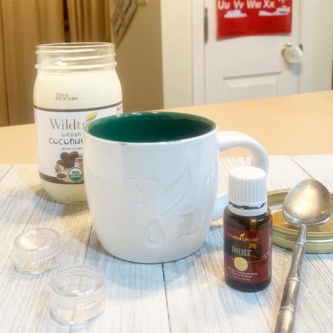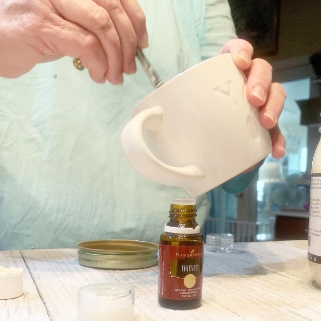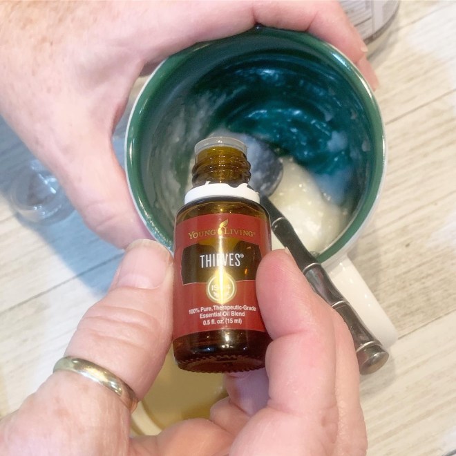 It’s easy…just add a few drops of YL Thieves EO to solid coconut oil and mix well. Put it in a container to keep in your first aid kit. You never know when those darned needles will attack again!