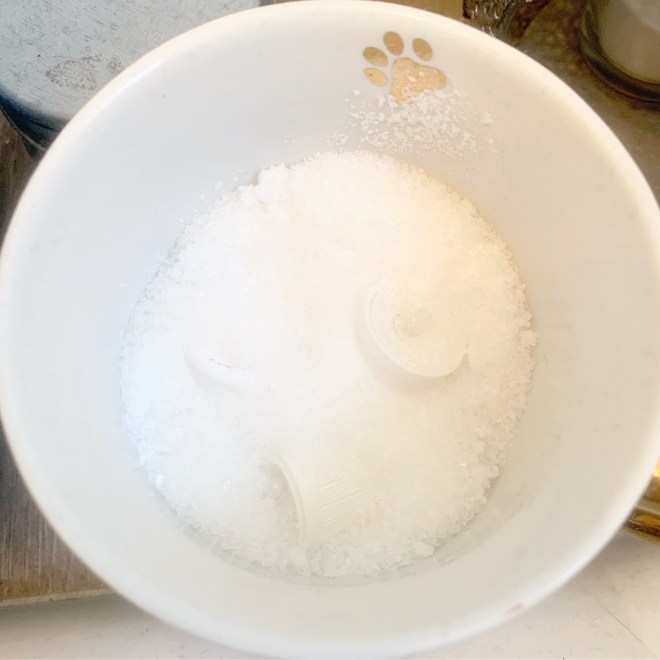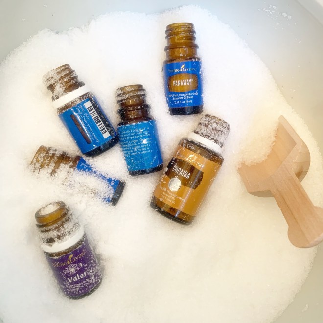 I remove the cap and dropper and fill the bottle with epsom salts. In this particular instance, I’m working on a blend of Panaway, Valor and Copaiba. After a day or so, or actually when I remember, I’ll empty the bottles into a container and then add enough epsom salt and sometimes pink himalayan salt to fill along with a few more drops of each oil. Makes a great gift for someone battling some aches & pains.